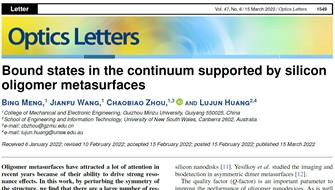 机械电子工程学院2018级应用物理专业本科生孟兵、王建福两位学生,在美国光学学会(Optica Publishing Group)旗下的光学顶刊Optics Letters(中科院二区,影响因子:3.776)上发表题目为“Bound states in the continuum supported by silicon oligomer metasurfaces”的学术论文,该研究成果是在 色色