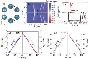 光学BIC是一种特殊的无辐射模式,当器件引入对称性扰动时,对称保护型BIC能够转成具有高品质因子的共振腔,能够极大地促进光和物质的相互作用。目前,这种对称性扰动的方式主要是通过破坏结构的几何对称性,由于工艺制造的局限性,这种激发方式很难在实验中得到较小的非对称参数,也就是很难获得超高的品质因子。在本工作中,通过移动低聚物介质纳米盘的相对位置,微小地打破结构的镜面对称性,可以将多个BIC转化为准BIC模式,这种激发方式能够精确控制对称保护型BIC的非对称参数,从而极大地提高了器件的制造容差,为超高品质因子微纳器件的实现提供了一条新的途径。有望推动非线性光器件、纳米腔激光器,光开关和传感器等高性能微纳米光学器件的实现。