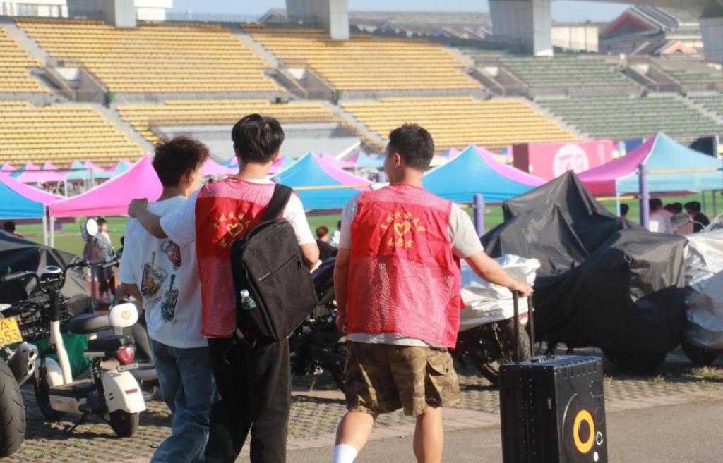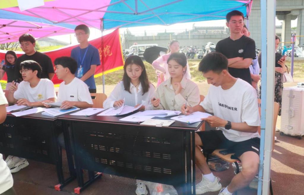 清晨,阳光洒满校园,志愿者们在接待点以饱满的热情迎接每一位新生的到来。