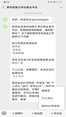 二、关注后点击“毕业生”—“个人中心”进行登录(用户名是学号,密码是学号后六位)