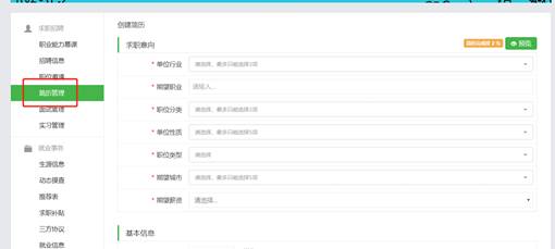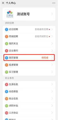 点击“简历管理”,按提示完成“求职意向”、“自我介绍”、“教育经历”、“能力介绍”等相关内容,简历完善度达“70%”以上后即可投递简历。