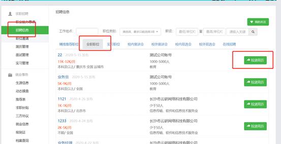 点击“招聘信息”,可以按类型查看职位并进行简历的投递。