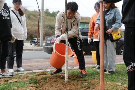沐浴初春温暖的阳光,在党委副书记陈丽和赵洪老师的带领下,同学们有序开展植树活动,大家手持锄头,干劲十足,将一颗颗充满生机和希望的树苗植入校区内。大家分工明确,运土、栽苗、培土,最后向它们浇水、施肥。现场气氛热烈,看着大家那份对绿色的痴情,的确令人感动。希望在以后的日子里,它们能茁壮成长,为学校增绿添彩!