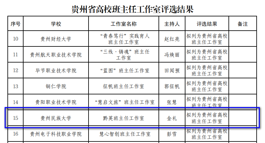 管延庆副书记主持建设的“引力”辅导员工作室获批第四批贵州省高校名辅导员工作室,金礼老师主持建设的“黔英”班主任工作室获批首批贵州省高校班主任工作室。